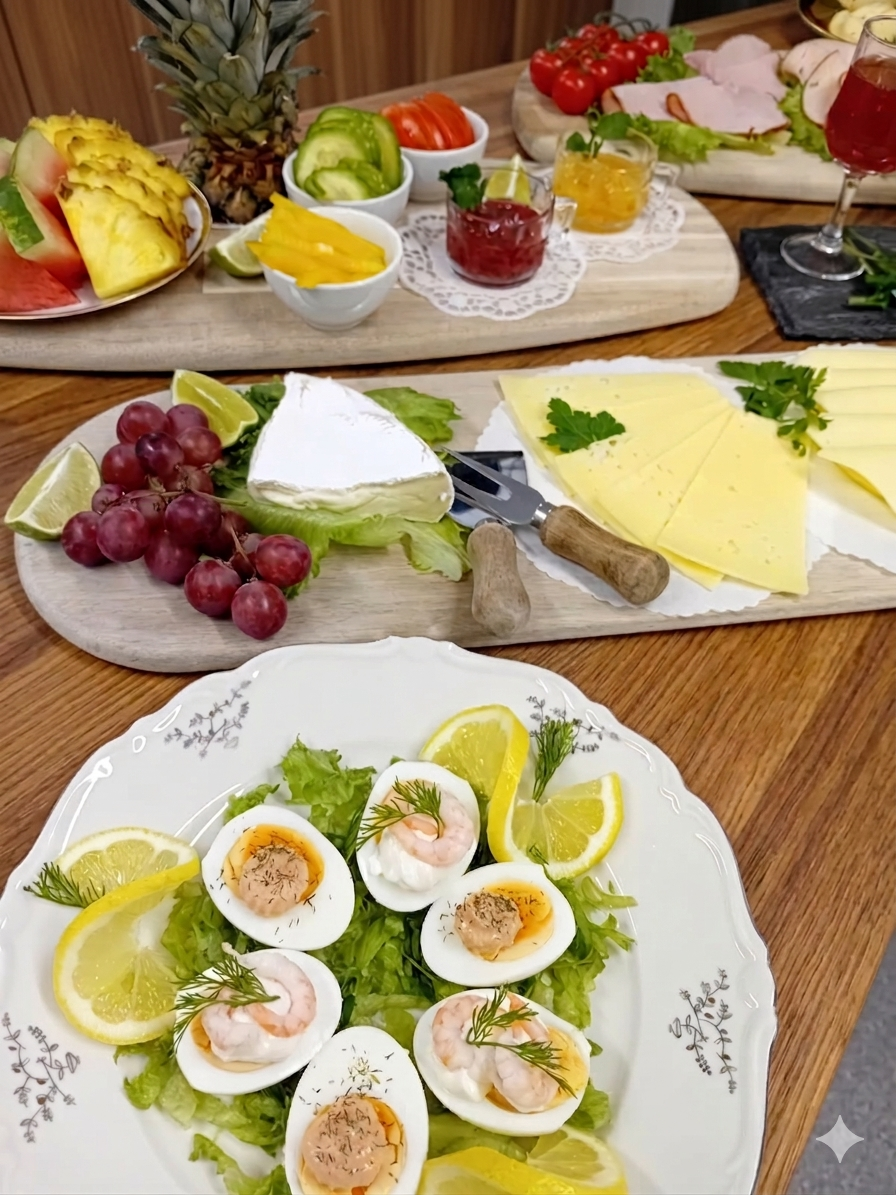 räkor, ägg, köttbullar, rödbetssallad, ost och skinka samt
