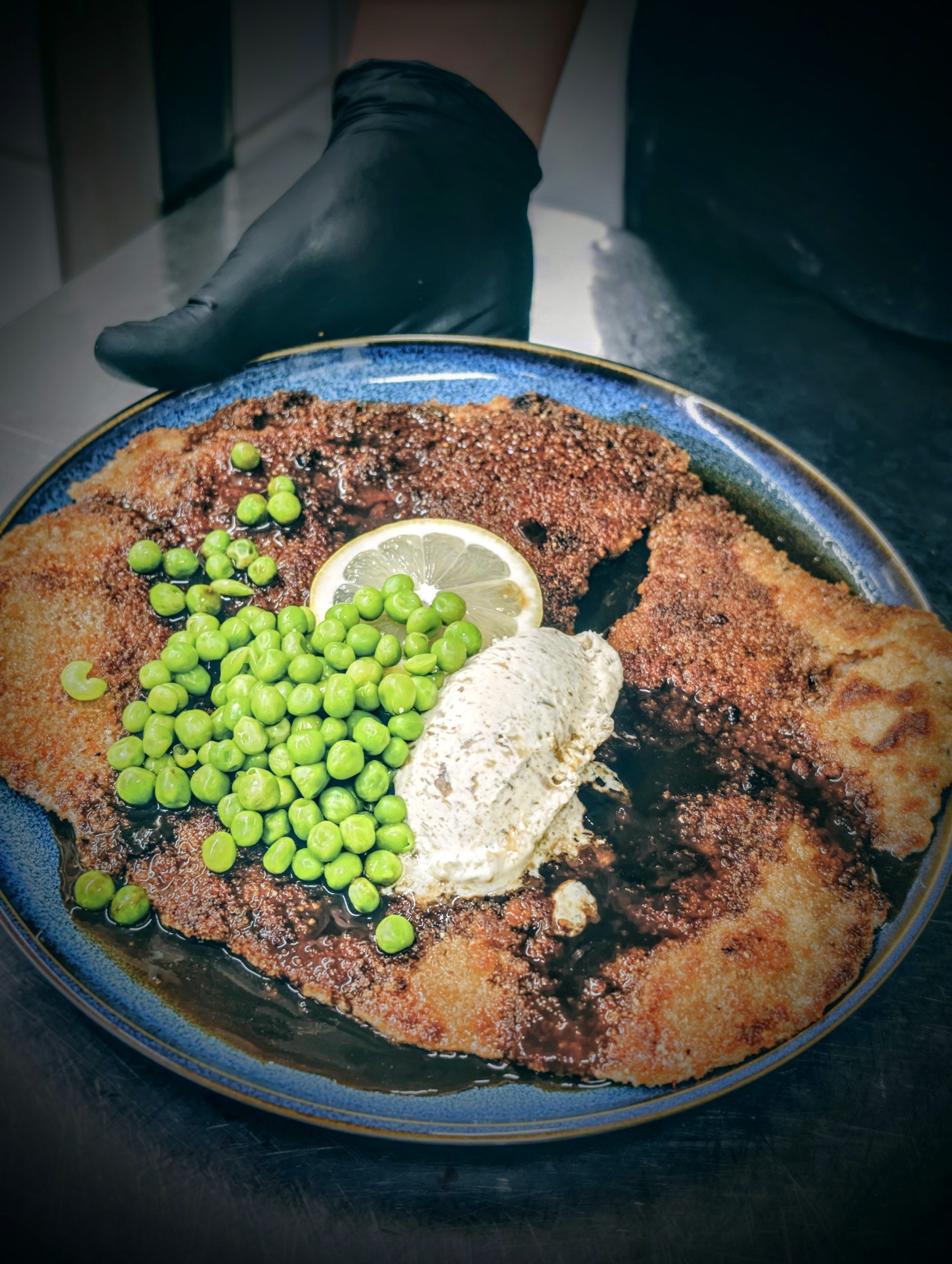 panerad schnitzel som serveras med stekt potatis alternativt pommes frites samt kapris/sardellsmör, gröna ärtor och citron